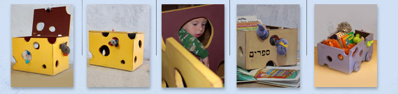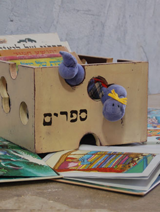 תיבה מחוררת באמצעות תולעת ספרים, המשמשת לסידור הספרייה או הצעצועים בחדר.