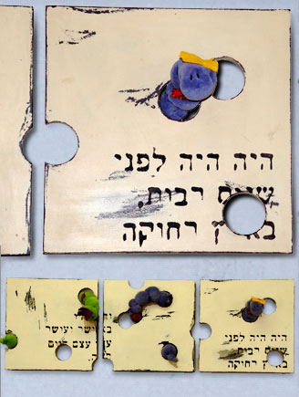סדרת תמונות הומוריסטיות לקיר בשילוב לוחות עץ ובובות בד.